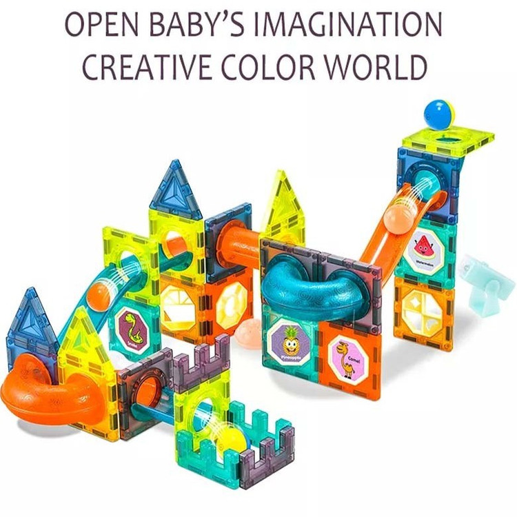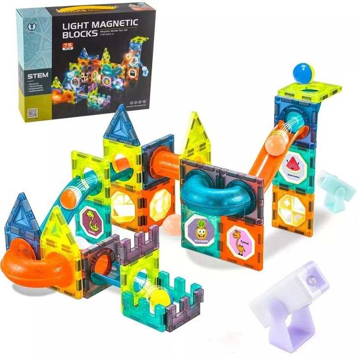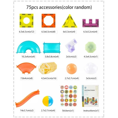 کاشی مغناطیسی 75 تکه از قطعات شفاف مغناطیسی و رنگارنگ تشکیل شده است. این کاشی آهنربایی کودکان را تشویق می کند تا هر آنچه را که در ذهن خلاقشان دارند بسازند. این کاشی مغناطیسی شامل سرسره های پلاستیکی، توپ های رنگی و چراغدار، مجموعه ای از اشکال هندسی مغناطیسی و برچسب است. بچه های شما می توانند با این کاشی مغناطیسی پیچ و خم ها، برج ها و بیشتر بسازند.مغناطیس به کار رفته در کاشی مغناطیسی بسیار قوی است و در هنگام بازی کردن به کودک کمک میکند تا به راحتی خراب نشود. بچه ها از ساخت و ساز خود احساس موفقیت می کنند و می توانند ساعت ها سرگرم شوند. مشخصات