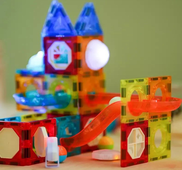اسباب بازی مگنتیک تایل چراغدار یک اسباب بازی آموزشی و ساختنی فوق العاده برای کودکان بالای سه سال است ، آن ها میتوانند با قطعات پلاستیکی و رنگارنگ مغناطیسی و سرسره های رنگی موجود در بسته بندی، سازه های خلاقانه بسازند و توپ های کوچک را روی آن ها رها کنند با چراغ های جذابش بچه ها رو به شدت جذب خودش میکنه همچنین 2 پروژکتور و 3 چراغ رنگی وجود دارد که مسیر حرکت توپ و سازه ها را بسیار زیبا میکند.
