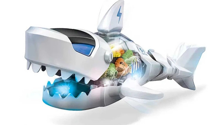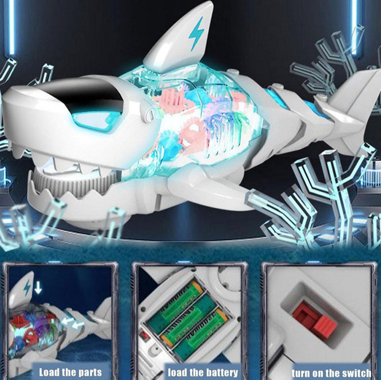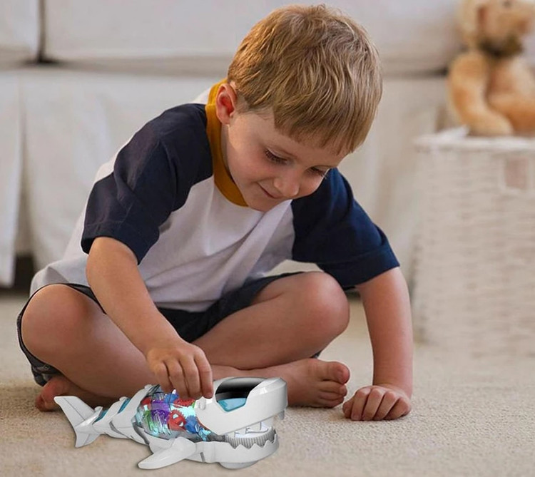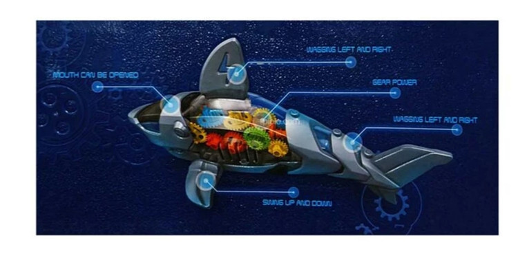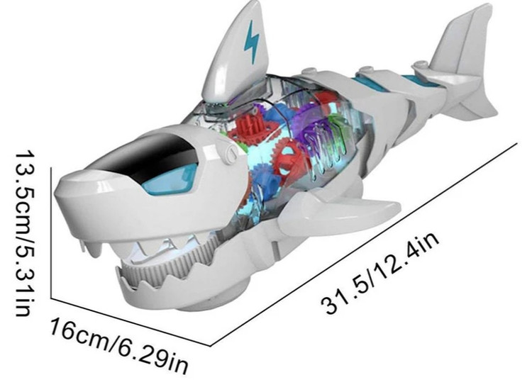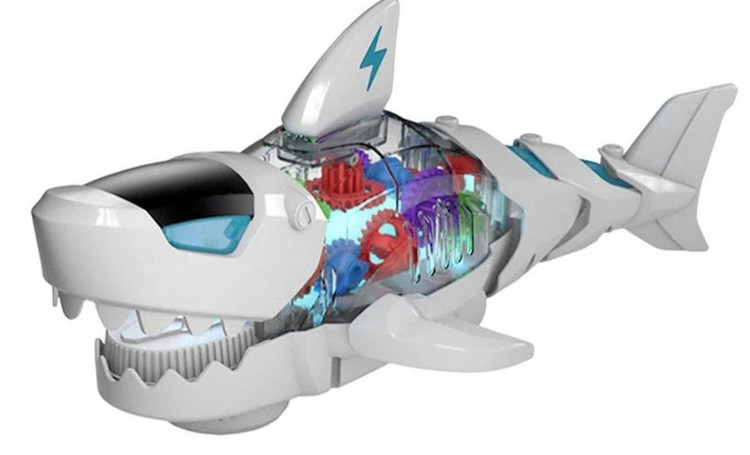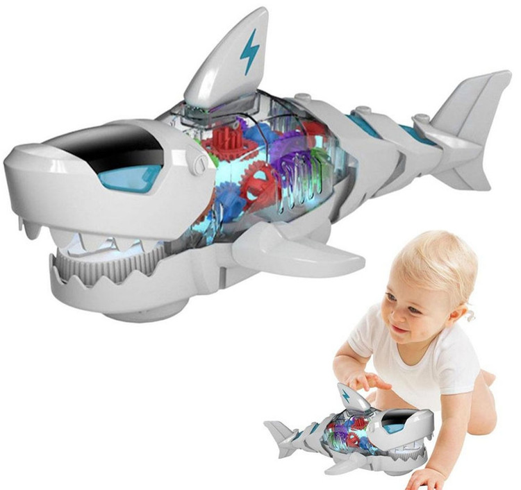 اسباب بازی کوسه چرخ دنده ای:این اسباب بازی بدنه ای شفاف دارد که چرخ دنده های رنگی بامزه اش از درون آن دیده می شوند و توجه هر کودکی را به خودش جلب می کند.قابلیت تکان دادن باله ها و دم خود را دارد و همچنین دهان آن باز و بسته می شود.به وسیله باتری تغذیه می شود و با روشن کردن آن شاهد تصویر زیبایی از نور و موسیقی و چرخ دنده های رنگی که می چرخند تا اجزا بدن کوسه را به حرکت در آوند خواهید بود.