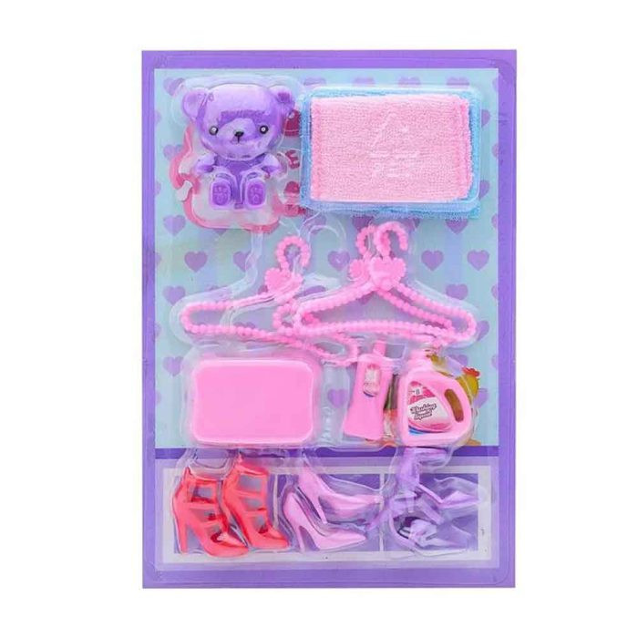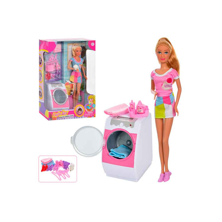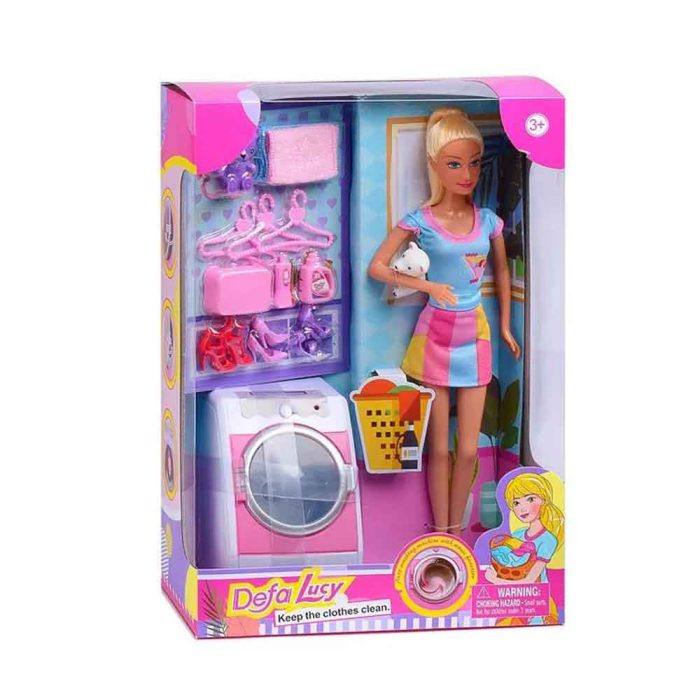 این مجموعه دفالوسی شامل یک باربی زیبا می باشد در 2 رنگ و طرح متفاوت موجود می باشد. این باربی زیبا شامل یک عدد خرس سفید یه عنوان عروسک می باشد و شامل چند لوازم خانگی مانند ماشین لباس شویی که قابلیت حرکت و نور دادن از خود را دارد، شامل یک عدد عروسک خرس زیبا می باشد. از دیگر اکسسوری های موجود در این پک می توان به 3 جفت کفش های رنگارنگ اشاره کرد + یک عدد کفشی که خود باربی پایش کرده است، همچنین شامل 3 عدد چوب رختی برای آویزان کردن لباس های باربی می باشد، این پک همچنین شامل یک عدد حوله نیز می باشد. این پک شامل لوازم جانبی ماشین لباس شویی مانند، مایع لباس شویی، پودر رخشویی و … است. منبع تغذیه ماشین لباسشویی موجود در این پک باربی، 2 عدد باتری نیم قلم است. این محصول از برند مشهور دفالوسی می باشد که از کیفیت بسیار بالایی برخوردار است. این باربی زیبا مفصلی می باشد و کاملا دست و پاهای آن خم می شوند.