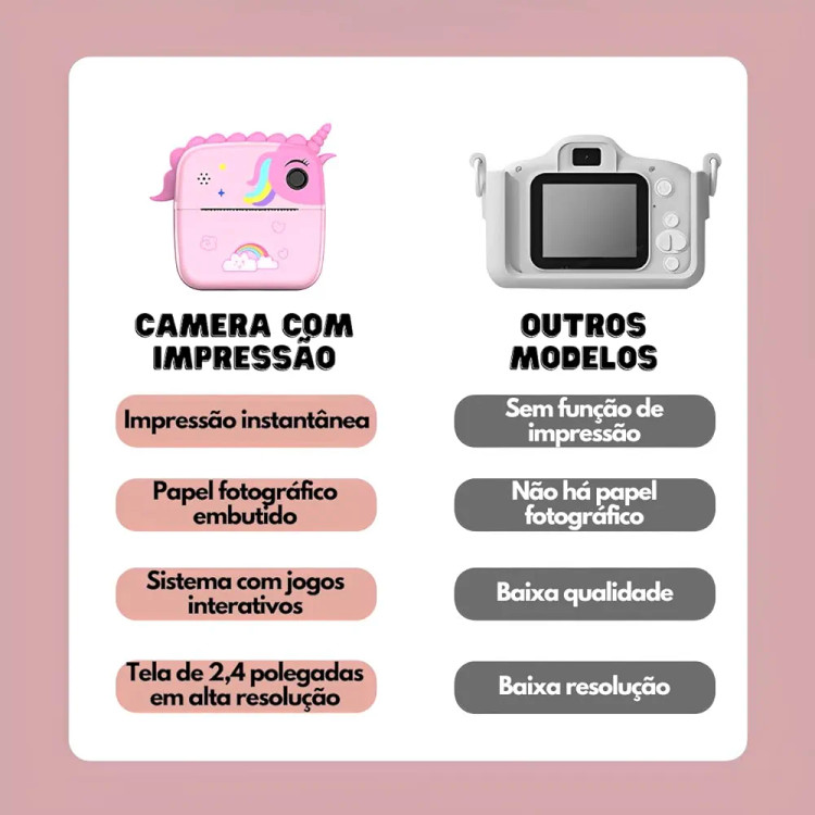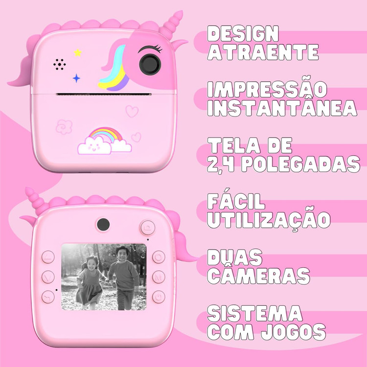 اسباب بازی دوربین عکاسی چاپ فوری کودک طرح یونی کورنیک دوربین زیبا کودکانه با قابلیت چاپ فوری است. این دوربین عکاسی علاوه بر چاپ عکس دارای قابلیت های متنوع دیگر برای کودکان است مثل قابلیت چاپ، قابلیت های چاپ عکس، پاک کردن عکس، قابلیت فیلم برداری، تنظیم تاریخ، تنظیمات، حالت بازی، پخش موزیک، قابلیت شارژ و... است. این دوربین توسط کابل شارژ usb از نوع تایپ c است که میتواند دوربین کودک را ساعت ها شارژ نگه دارد. این دوربین دارای بند گردنی با طرح یونی کورن می باشد. نوع چاپ عکس این دوربین به صورت سیاه و سفید است کودکان میتوانند به راحتی عکس بگیرند و با زدن یک دکمه عکس های خود را چاپ کنند.