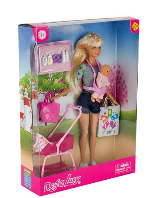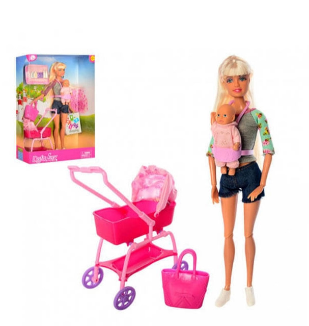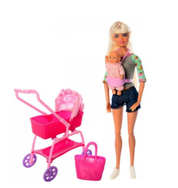 در این مجموعه باربی یک بلوز طرحدار به همراه یک شلوارک جین کوتاه بر تن دارد که هم میتوان نوزاد را داخل آغوشی قرار داد هم آن را در داخل کالسکه قرار دهید. باربی زن دارای موهای بلند و طلایی زیبایی است که قابل شانه کردن و شستشو بوده و حالت چتری در جلو صورت دارد که بسیار به زیبایی او افزوده است و یک کیسه خرید درون جعبه قرار داده شده است.