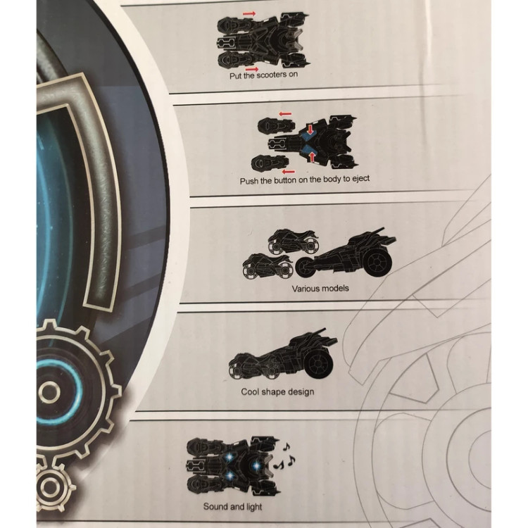- این ماشین متریال فلزی و پلاستیکی دارد.موزیکال است . چراغدار است. عقب کش است .دارای دو موتور در کناره های ماشین است. که با فشردن دکمه آبی رنگ روی ماشین به صورت تفکیکی هر کدام از موتور ها پرتاب می شود.