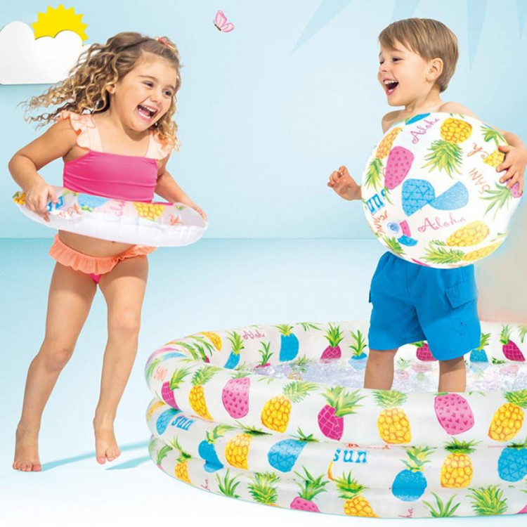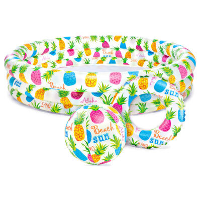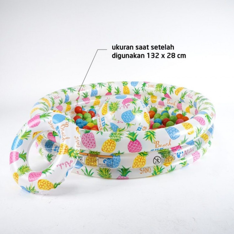 استخر بادی کودک همراه توپ و حلقه با طراحی جذاب و چشمنوازی که جذابیت خاصی در بین کودکان ایجاد میکند خود استخر دارای یک طرح میوهای جذاب است که شامل برشهای ، آناناس و مرکبات میشود و فضای دلانگیز و زیبایی را ایجاد میکند. با قطر 132 و ارتفاع 28 سانتیمتر، این استخر بادی فضای کافی برای شنای 1 تا 2 کودک بالای 2 سال را فراهم میکند. . توپ از مواد محکم و مقاوم در برابر سوراخ شدن ساخته شده است