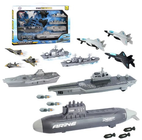 ناو هواپیمابر ناب سل مدل زیر دریایی مجموعه 17 عددی زیر دریایی Super Army Launch Submarines این مجموعه از نوع اسباببازیهای ارتشی (نظامی) محسوب میشود و برای کودکان بالای ۳ سال طراحی شده است. وجود قطعات جداشونده، باعث میشود کودک نحوه ترکیب تجهیزات نظامی را بیاموزد و تمرکز و مهارت دستورزیاش تقویت شود.ترکیب هواپیما، زیردریایی، موشک و ناو باعث تنوع و خلاقیت بیشتر در بازی میشود و شامل ناو و زیر دریایی و هواپیمای جنگنده ،موشک و قطعات مونتاژی میباشدو جت ها عقب کش بوده و قابلیت پرتاب از روی ناو را دارند و این ناو زیر دریایی ناب سل میتواند میتواند برای بازی چندنفره با دوستان بسیار سرگرمکننده باشد.