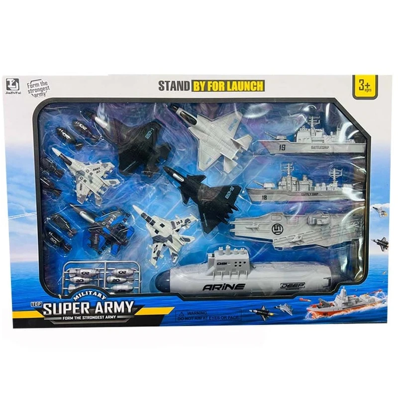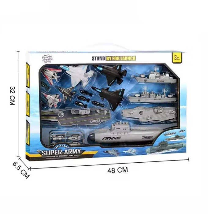 ناو هواپیمابر ناب سل مدل زیر دریایی مجموعه 17 عددی زیر دریایی Super Army Launch Submarines این مجموعه از نوع اسباببازیهای ارتشی (نظامی) محسوب میشود و برای کودکان بالای ۳ سال طراحی شده است. وجود قطعات جداشونده، باعث میشود کودک نحوه ترکیب تجهیزات نظامی را بیاموزد و تمرکز و مهارت دستورزیاش تقویت شود.ترکیب هواپیما، زیردریایی، موشک و ناو باعث تنوع و خلاقیت بیشتر در بازی میشود و شامل ناو و زیر دریایی و هواپیمای جنگنده ،موشک و قطعات مونتاژی میباشدو جت ها عقب کش بوده و قابلیت پرتاب از روی ناو را دارند و این ناو زیر دریایی ناب سل میتواند میتواند برای بازی چندنفره با دوستان بسیار سرگرمکننده باشد.