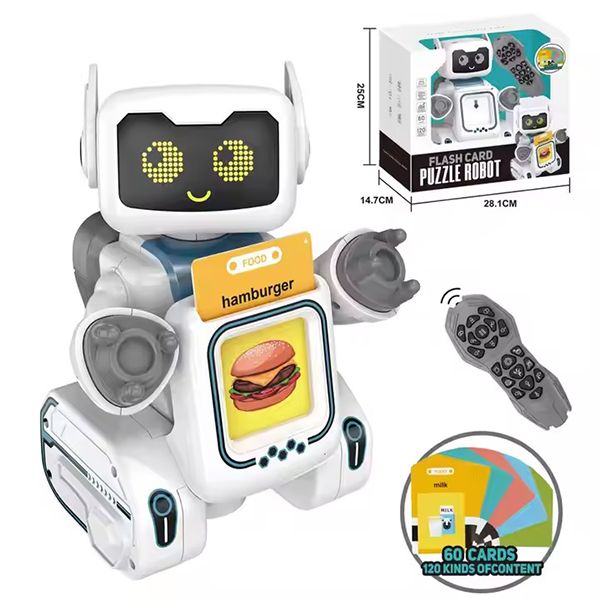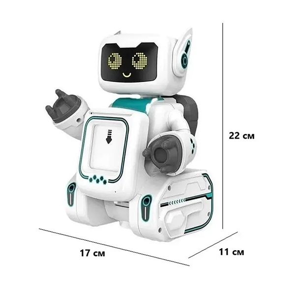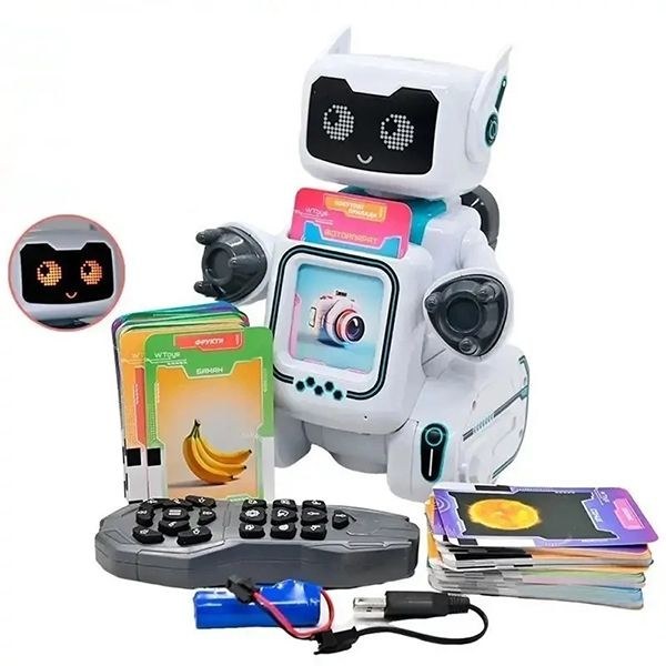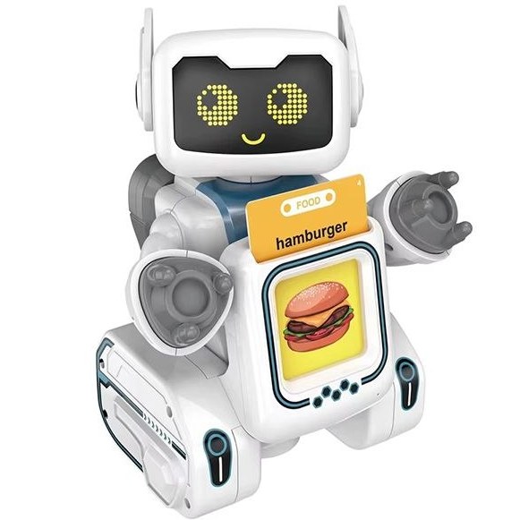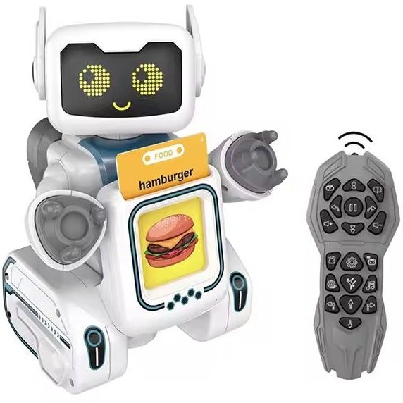 سایر توضیحات: ابعاد جعبه 25*14.7*28 سانتی متر ابعاد ربات 17*11*22 سانتی متر دارای 6 آهنگ و 6 مدل رقص دارای 72 فلش کارت دوطرفه آموزشی (شامل : حیوانات ،میوه، سبزیجات، رنگ، مشاغل و غذا) دارای 144 تصویر برای یادگیری قابلیت حرکت در تمام جهات (جلو، عقب، چرخش و رقص) ح حالت دمو با حرکت خودکار مناسب تقویت دایره لغات و مهارتهای شنیداری دکمههای لمسی روی سر ربات برای تکرار کلمات قابلیت برنامهریزی حرکات و عملکردها دارای باتری قابل شارژ 3.7 ولت و کابل شارژ ریموت کنترل نیاز به 2 باتری نیم قلم دارد (در جعبه موجود نمی باشد) ساخته شده از پلاستیک مطابق با استانداردهای اروپایی (CE) مناسب بالای 3 سال