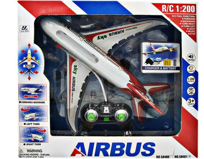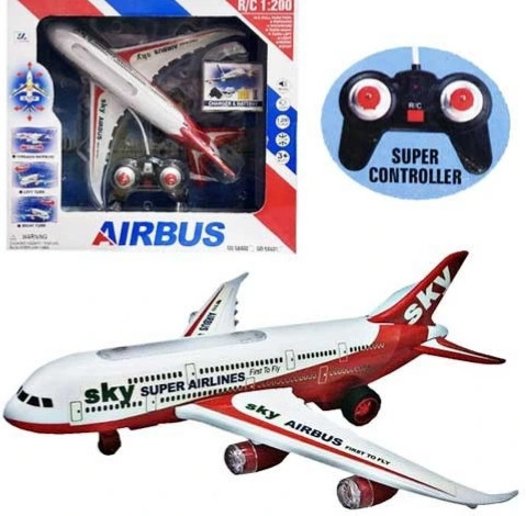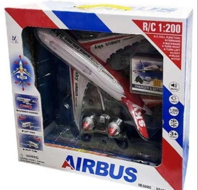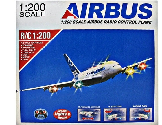 هواپیما کنترلی شارژی ایرباس a380 : هواپیما جذاب با بدنه با کیفیت ومقاوم است. ابعاد نسبتا بزرگی دارد و با اینکه نسبت به سایز واقعی اش حدود20 برابر کوچک تر است حس واقعی بودن را به کودکان القا می کند .ابعاد بسته حدود 36*12*30 می باشد.قابلیت پرواز ندارد ولی قابلیت حرکت و چرخش دارد که با ریموت کنترل داخل بسته به راحتی انجام می گیرد.منبع تغذیه این اسباب بازی یک باتری قابل شارژ 4.8 ولتی است که داخل بسته قرر داد. دارای یک ریموت کنترل است که به وسیله دو عدد باتری قلمی 1.5 ولتی AA تغذیه می شود.