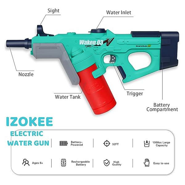 جنس این تفنگ آبپاش از پلاستیک مرغوب بوده (ABS با بهترین کیفیت) و در برابر گرما مقام بوده و تغییر رنگ نمیدهد.برد و شلیک این تفنگ بصورت میانگین حدود 10 تا 15 متر و ظرفیت گنجایش آن حدود 1200 میلی لیتر آب می باشد. و مناسب برای سنین 8 سال به بالا می باشد.