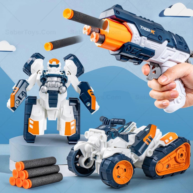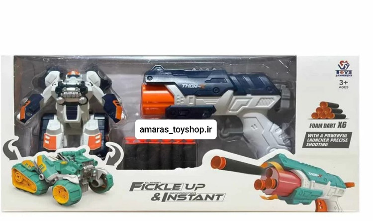 این تفنگ اسباب بازی می تواند 6 تیر فومی موجود در بسته بندی خود را پرتاب کند. این تیر ها دارای سری های چسبونکی هستند، که می توانند به سطوح صافی مانند شیشه و سرامیک بچسبند. قسمت سری این تفنگ اسباب بازی بی خطر در هنگام شلیک می چرخد، و به همین طریق احساس واقعی تری را به فرزند شما منتقل کند. در بسته بندی این محصول یک ربات تبدیل شونده نیز قرار دارد، که می تواند به یک موتور چهار چرخ تغییر شکل دهد.