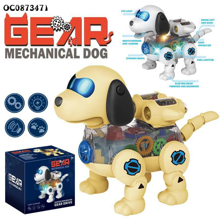 اسباب بازی سگ چرخ دنده ای موزیکال آیتم G-1 یکی از بهترین محصولات سرگرم کننده تولید شده برای رده سنی 3 سال به بالا است ، که بدون باتری و یا با باتری برای کودک یک اسباب بازی مناسب است . مفصل های این محصول به صورت عضروفی ساخته شده و امکان حرکت کردن ، باز و بسته کردن دهان و یا تکان دادن دم را را دارا میباشد . همچنین به دلیل پخش موزیک و نورپردازی جذاب و رنگی اش توجه بیشتری را به خود جلب کرده است .قاب شفاف یک مکانیسم پیچیده با چرخ دنده هایی را نشان می دهد که هنگام حرکت روشن می شوند.
