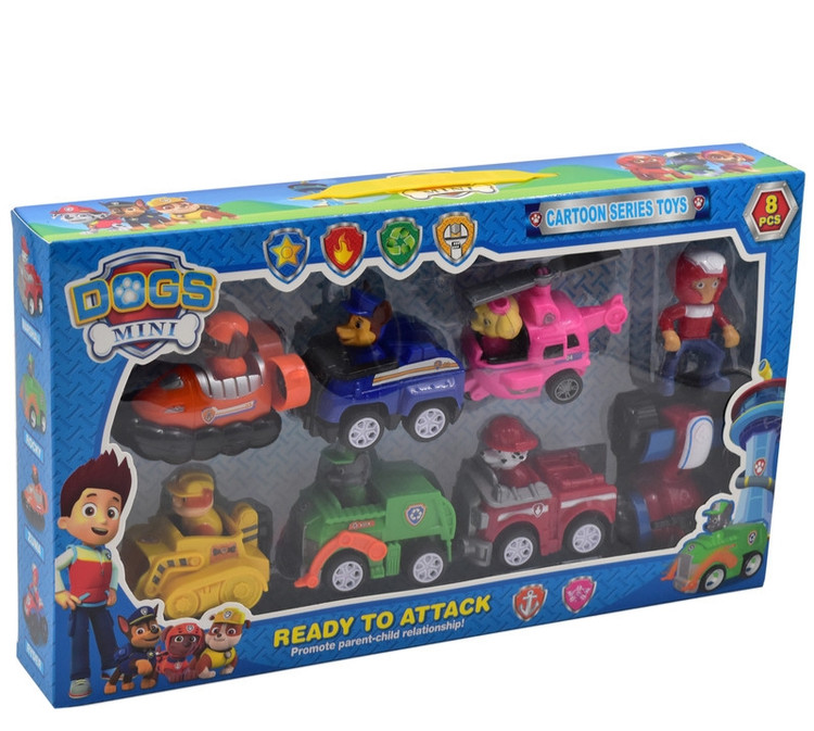 این محصول برگرفته از انیمیشن معروف سگ های نگهبان بوده و یک مجموعه 8 عددی از ماشین به همراه سگ های نگهبان و فرمانده رایدر در یک جعبه عرضه می گردد. ماشین ها دارای سیستم عقب کش هستند. این بسته 8 عددی مناسب برای کودکان بالای 3 سال و از جنس پلاستیک با کیفیت و قابل شستشو می باشد. سرنشین های ماشین ها 7 شخصیت انیمیشنی حاضر در کارتون سگ های نگهبان بوده و در آن واحد یک ست اسباب بازی سگ های نگهبان متنوع به رنگ های صورتی، قرمز، سبز، آبی، نارنجی، زرد در اختیار کودک قرار می گیرد.و کودک می تواند به همراه دوستان خود یک بازی گروهی داشته و به راحتی داستان های مجموعه را بازسازی کند.