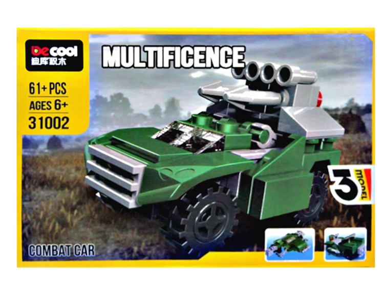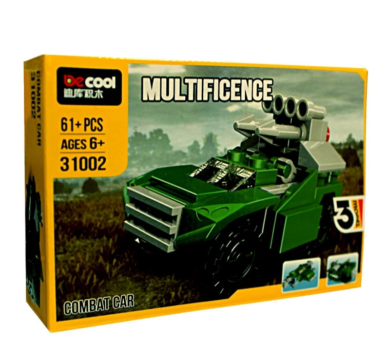 لگو ماشین جنگی سه مدل decool 31002 یک طرح دوست داشتنی که دارای 61 قطعه لگویی میباشد. قطعات این اسباب بازی با استفاده از پلاستیک ABS ساخته شده اند، و کیفیت بسیار بالایی دارند. با استفاده از قطعات این لگو میتوانید یک طرح جذاب ماشین را بسازید.